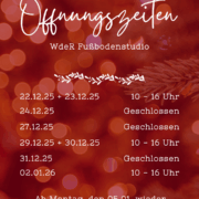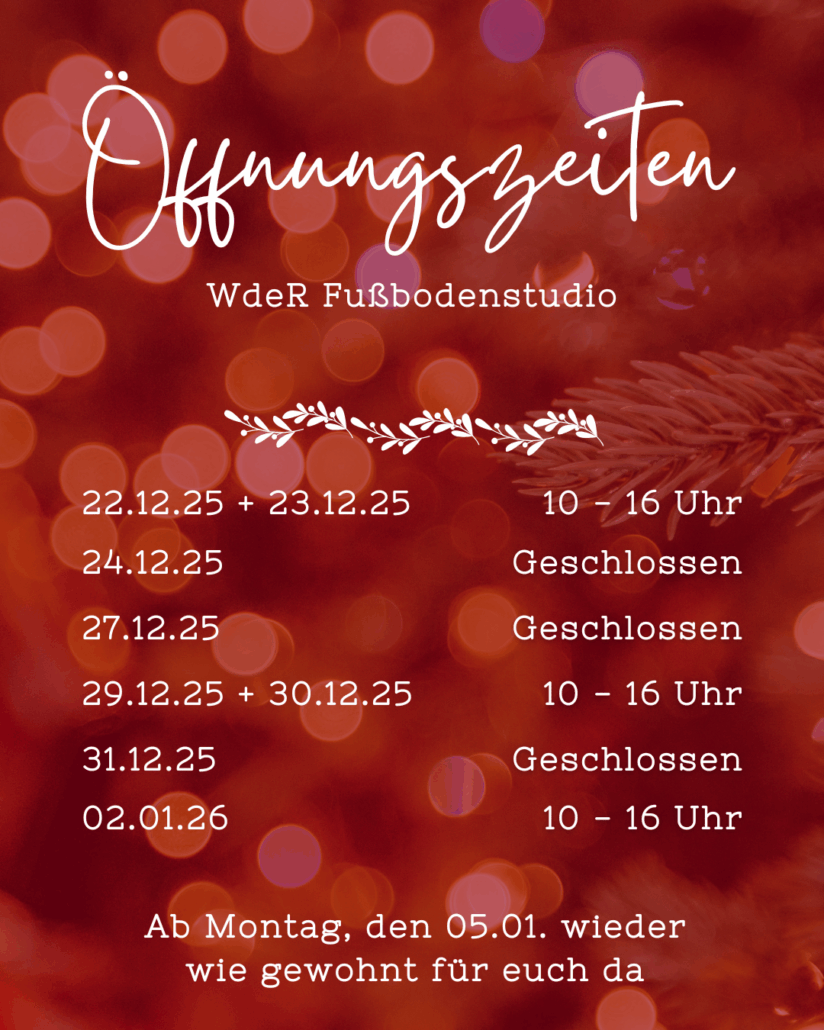 Damit ihr euren Besuch im WdeR Fußbodenstudio zwischen den Jahren planen könnt, findet ihr hier unsere Öffnungszeiten während der Feiertage.